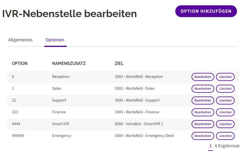 In den Einstellungen unter Allgemeines der IVR-Nebenstelle können Sie die maximale Anzahl von Ziffern für IVR-Optionen konfigurieren. Erlaubte Werte sind von 1 bis 6. Wenn 1 konfiguriert ist (Standardwert), kann im IVR-Menü nur eine Ziffer (0 bis 9) verwendet werden. Wenn 2 konfiguriert ist, können im IVR-Menü bis zu zwei Ziffern (0 bis 99) verwendet werden. Wenn die maximale Anzahl von sechs Ziffern konfiguriert ist, können IVR-Optionen bis zu 6 Ziffern haben (0 bis 999999).