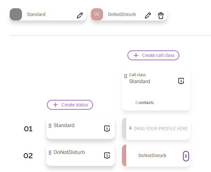 | When you have configured multiple call classes assign for each call class a profile to the Do-Not-Disturb Status, this ensures that DND is applied for every incoming call. You can assign to each call class/Do-Not-Disturb status a different profile, so that depending on who is calling calls can be routed differently when DND is enabled. |
