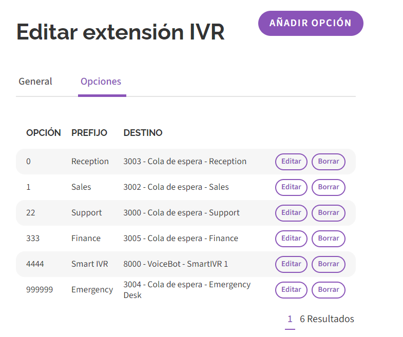 Dentro de una extensión IVR puedes configurar opciones IVR con diferentes longitudes de dígitos, como se muestra en el siguiente ejemplo.