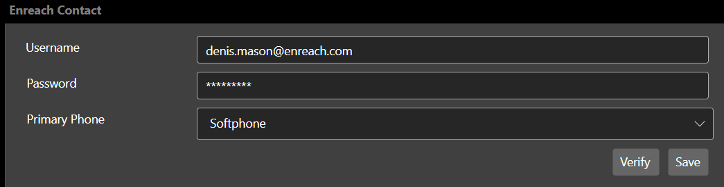 7 Voer de Enreach Contact webgebruiker e-mail adres en wachtwoord van de gebruiker in op de Enreach Contact Phone Connector.