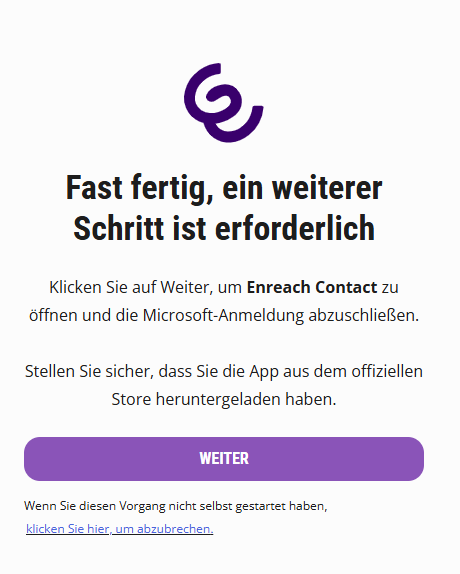| Wenn die Meldung Ihre Authentifizierung ist abgelaufen erscheint, müssen Sie sich erneut mit Ihrem Microsoft-Konto authentifizieren. Microsoft kann Sie auffordern, sich häufiger anzumelden, bis Enreach Contact Desktop als vertrauenswürdige Anwendung erkannt wird. |
