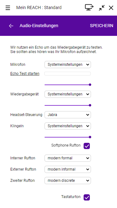 Sie müssen in Enreach Contact Desktop das bevorzugte Jabra-Gerät in den Audio-Einstellungen auswählen. Dies ist für die Headset-Steuerung zwingend erforderlich. Die Auswahl Systemeinstellungen ermöglicht keine Headset-Integration.