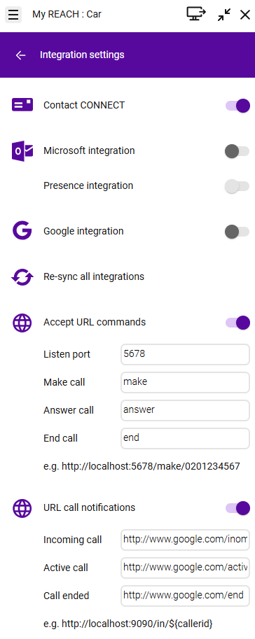 Accept URL Commands | Third-party application (e.g. CRM) Enreach Contact Desktop Client | Allows third-party applications to control call actions via HTTP requests. The URL commands must match the exact format expected by the Enreach Contact Desktop Client. |