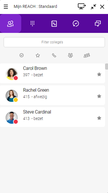 De Enreach Contact Desktop gebruikersinterface is verdeeld in vijf secties die het mogelijk maken om verschillende acties uit te voeren: