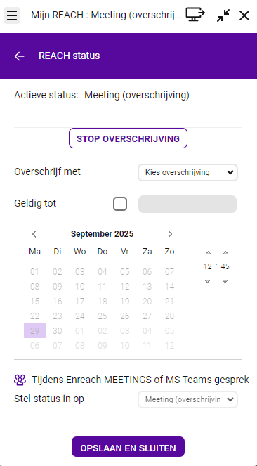 De gekozen status wordt actief zodra je in een Enreach Meetings sessie zit of in een MS Teams gesprek.
