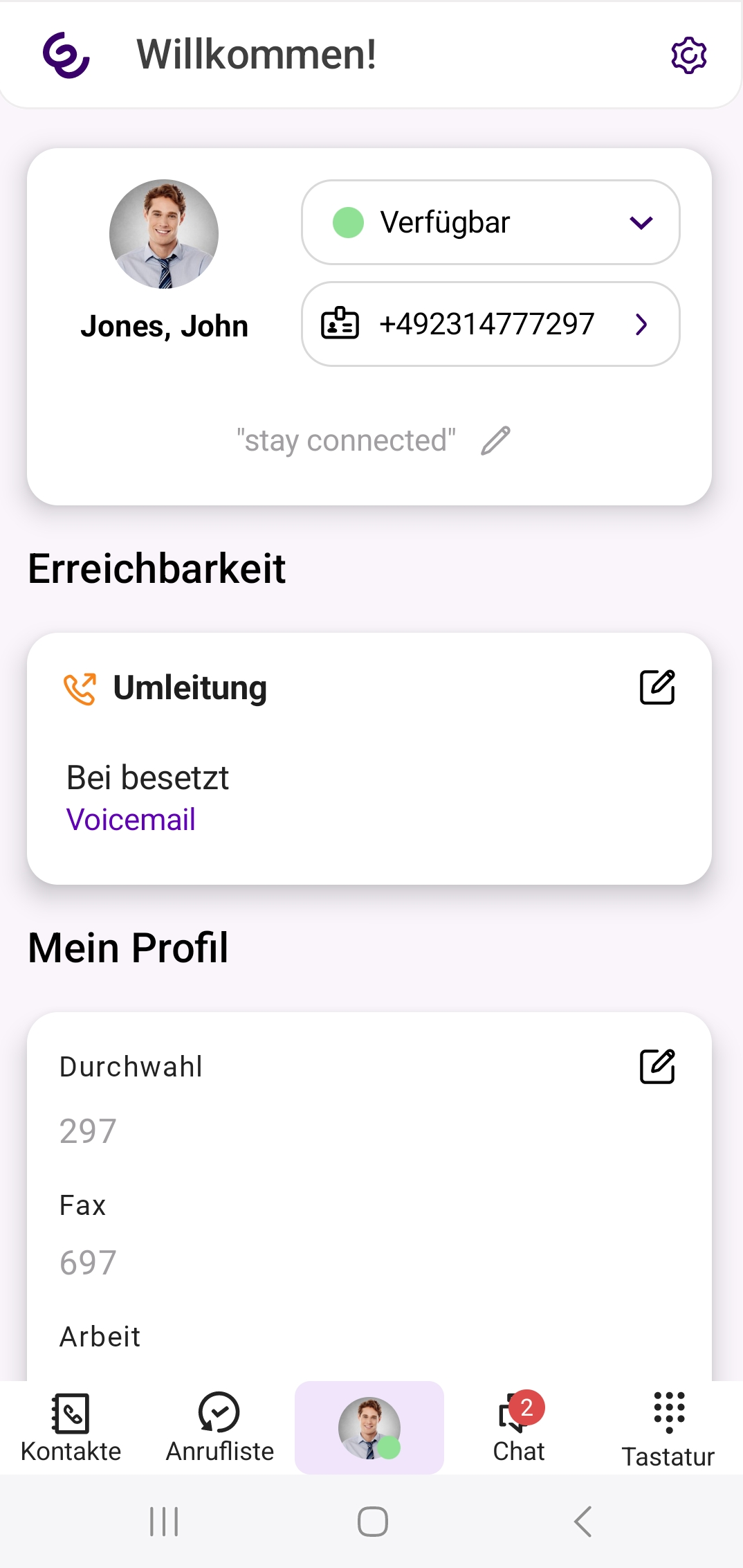 Statussignalisierung und Anrufer-ID wählen und auf einen Blick sehen welche Anrufer-ID Sie für ausgehende Anrufe nutzen. Weitere persönliche Informationen wie z. B. Ihre Durchwahl oder Ihre E-Mail-Adresse finden Sie unter