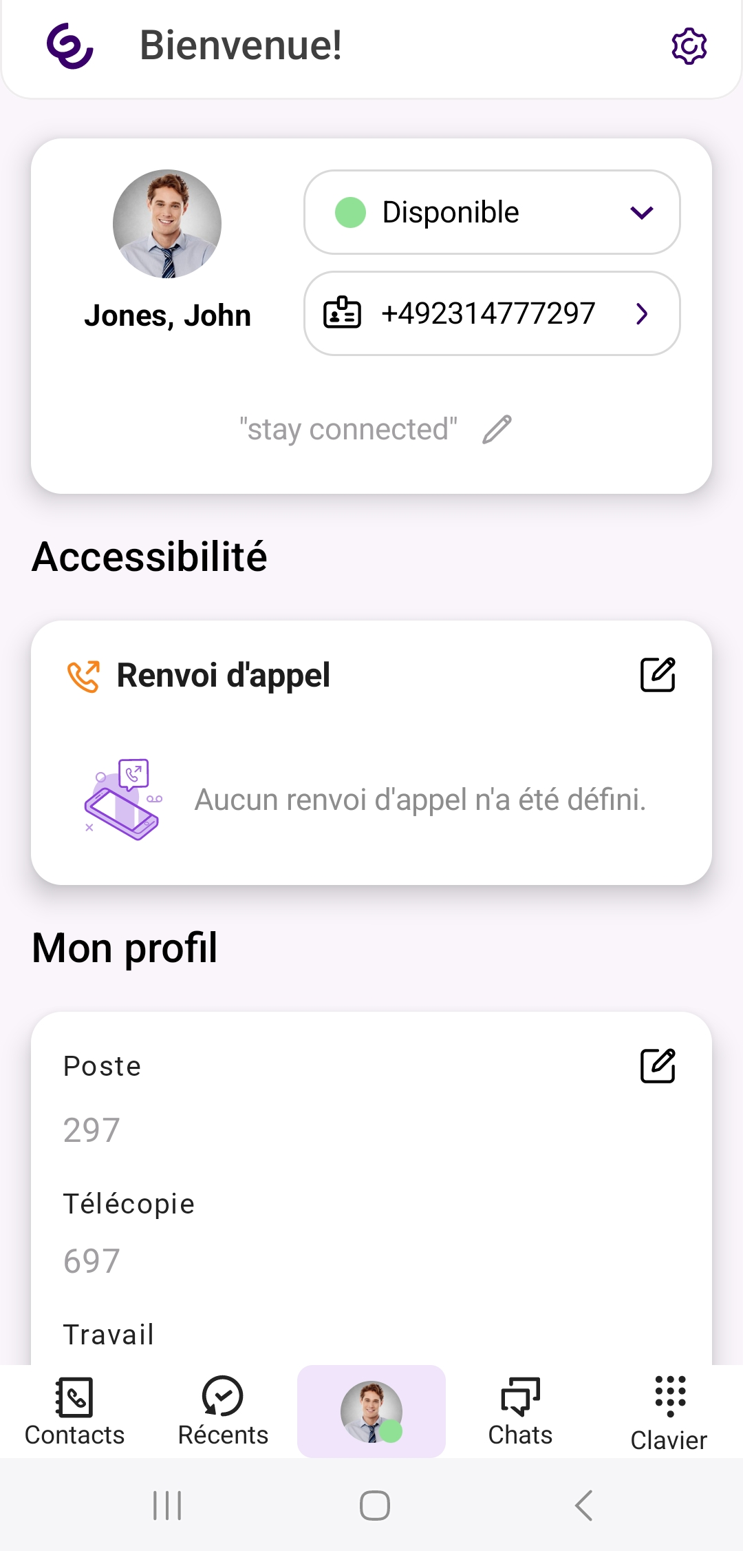 Renvoi d'appel est également visible sur le tableau de bord et peut être personnalisée directement.