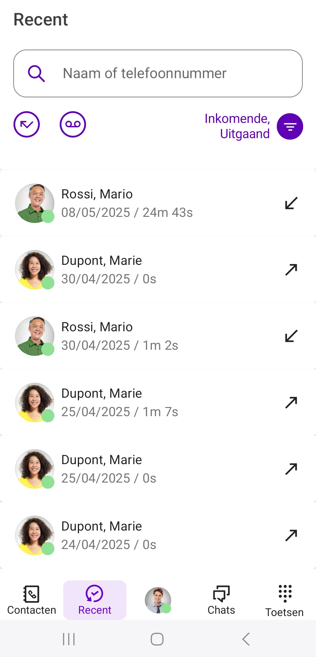In de Recent worden alle ontvangen en gevoerde gesprekken chronologisch opgesomd.