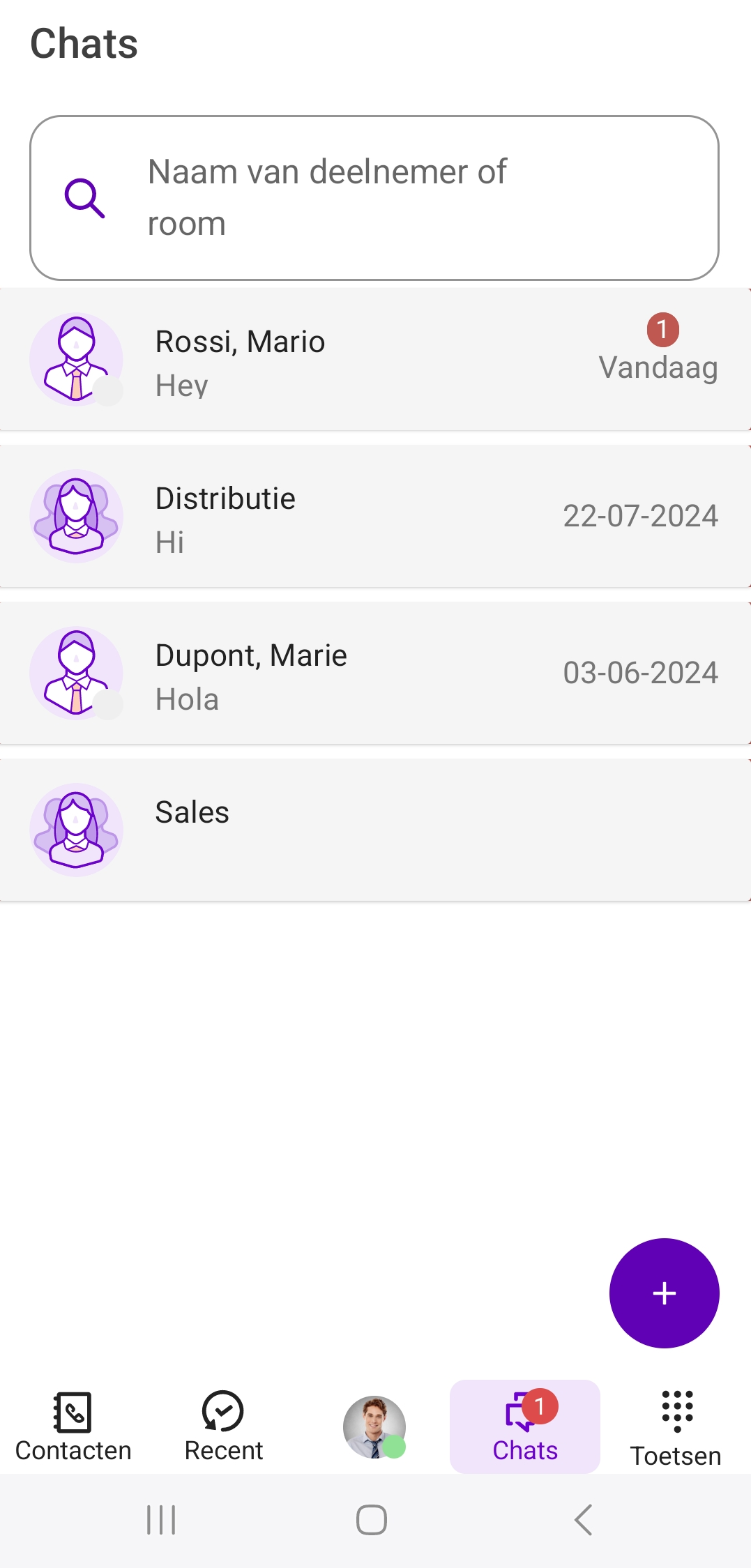 Je kunt het zoekveld gebruiken om specifiek te zoeken naar deelnemers of ruimtenamen binnen de chats.