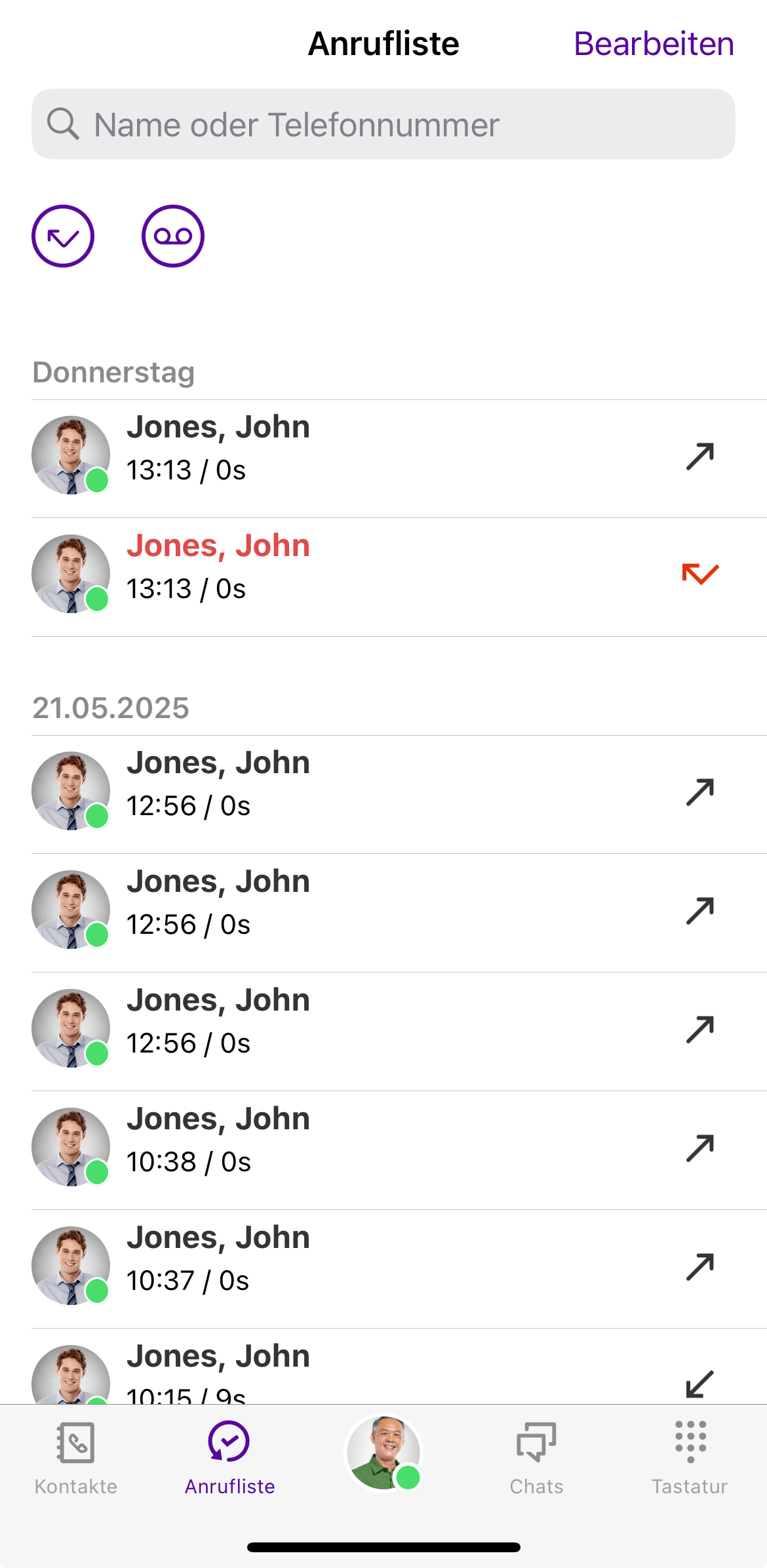 Ein Pfeil im Eintrag zeigt an, ob es sich um einen eingegangen, ausgehenden oder entgangenen Anruf handelt. Wenn Sie eine Voicemail empfangen haben, wird dies ebenfalls mit einem Symbol angezeigt.