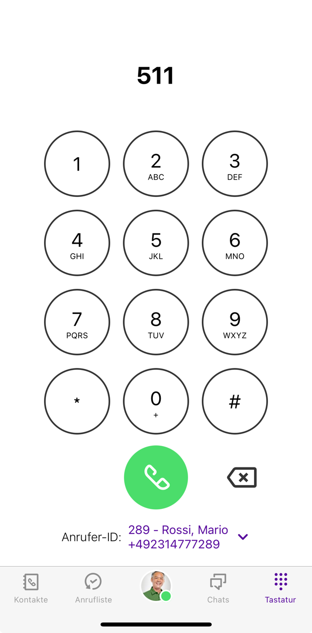 Über das Icon steht Ihnen ein Ziffernblock zur Verfügung, den Sie wie bei einem normalen Telefon zur Direkteingabe von Telefonnummern verwenden können. Sie können Telefonnummern sowie DTMF-Zeichen aus anderen Anwendungen kopieren und in das Eingabefeld oberhalb der Tastatur einfügen. Siehe auch So starten Sie einen Anruf über die Tastatur.