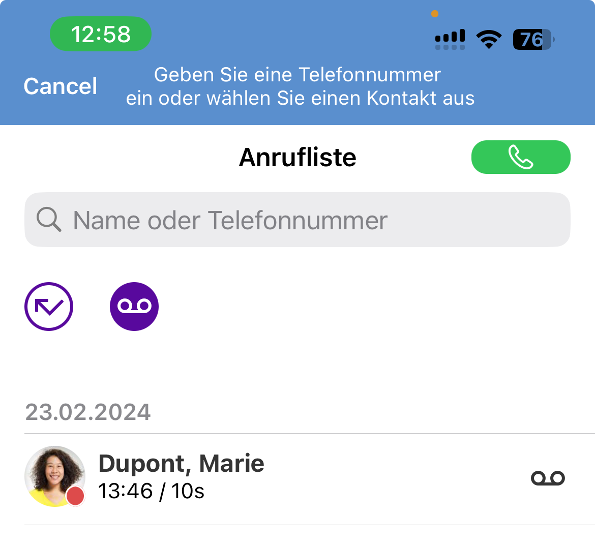 Während eines aktiven Anrufs können Sie durch die Bereiche von Swyx Mobile blättern oder andere Anwendungen verwenden. Aktive Anrufe werden auf zwei verschiedene Arten angezeigt: ein grüner Balken in der Statusleiste und eine grüne Schaltfläche in jedem Bereich von Swyx Mobile. Damit können Sie zur App bzw. zum Anruf zurückkehren.