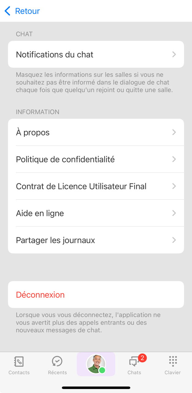, vous pouvez effectuer divers réglages pour les différentes sections de l'application et vous déconnecter de Swyx Mobile. Voir également la section