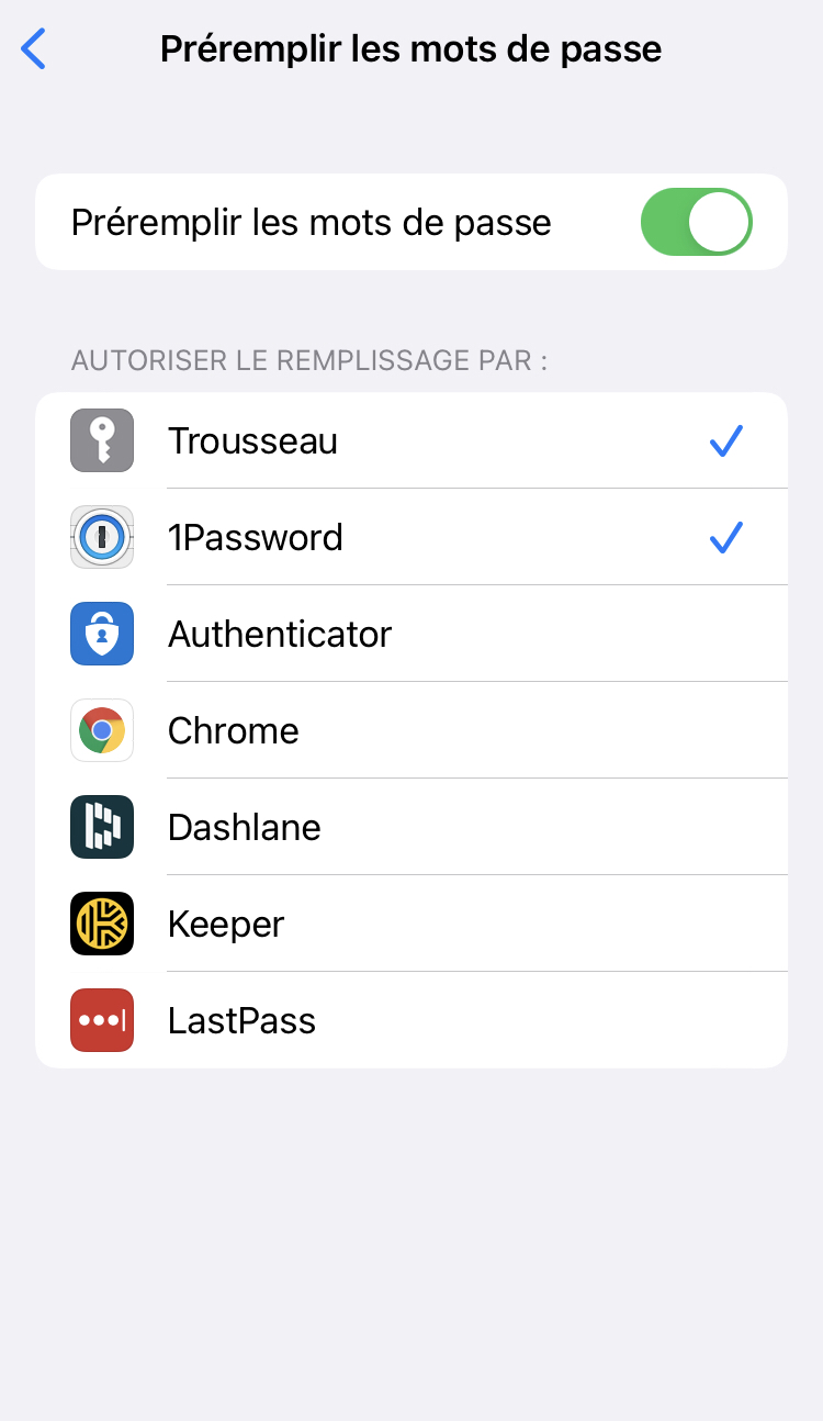 | Vous ne pouvez utiliser Préremplir les mots de passe que si vous avez sauvegardé des identifiants dans un gestionnaire de mots de passe. Vous ne pouvez également sélectionner que deux gestionnaires de mots de passe dans votre liste : le trousseau (iCloud) et/ou un gestionnaire de mots de passe tiers. |