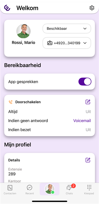 Statussignalering en nummerweergave selecteren en in één oogopslag zien welke nummerweergave je gebruikt voor uitgaande gesprekken. Meer persoonlijke informatie, zoals jouw toestelnummer of e-mailadres, kun je vinden op