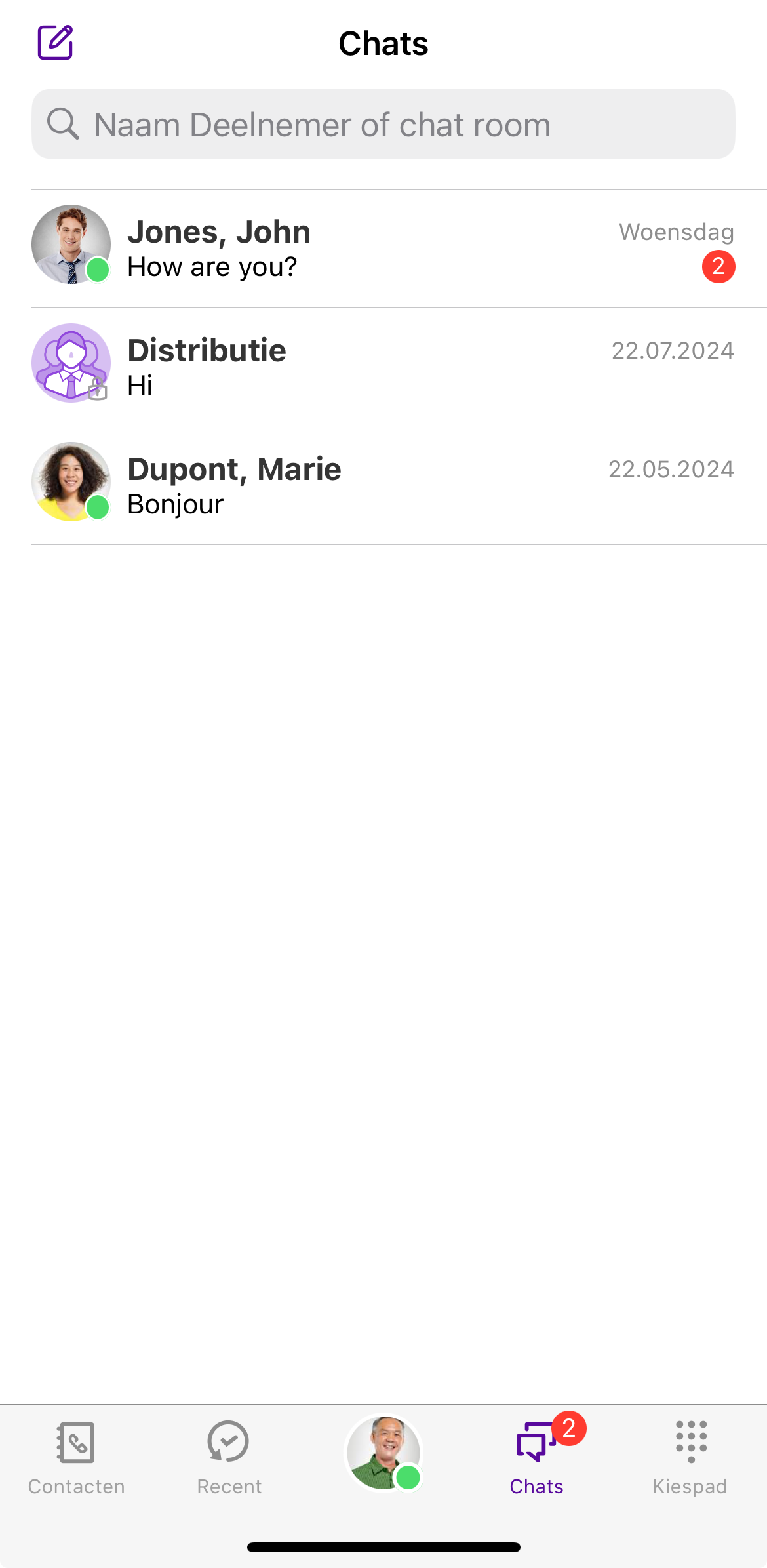 Je kunt het zoekveld gebruiken om specifiek te zoeken naar deelnemers of ruimtenamen binnen de chats.