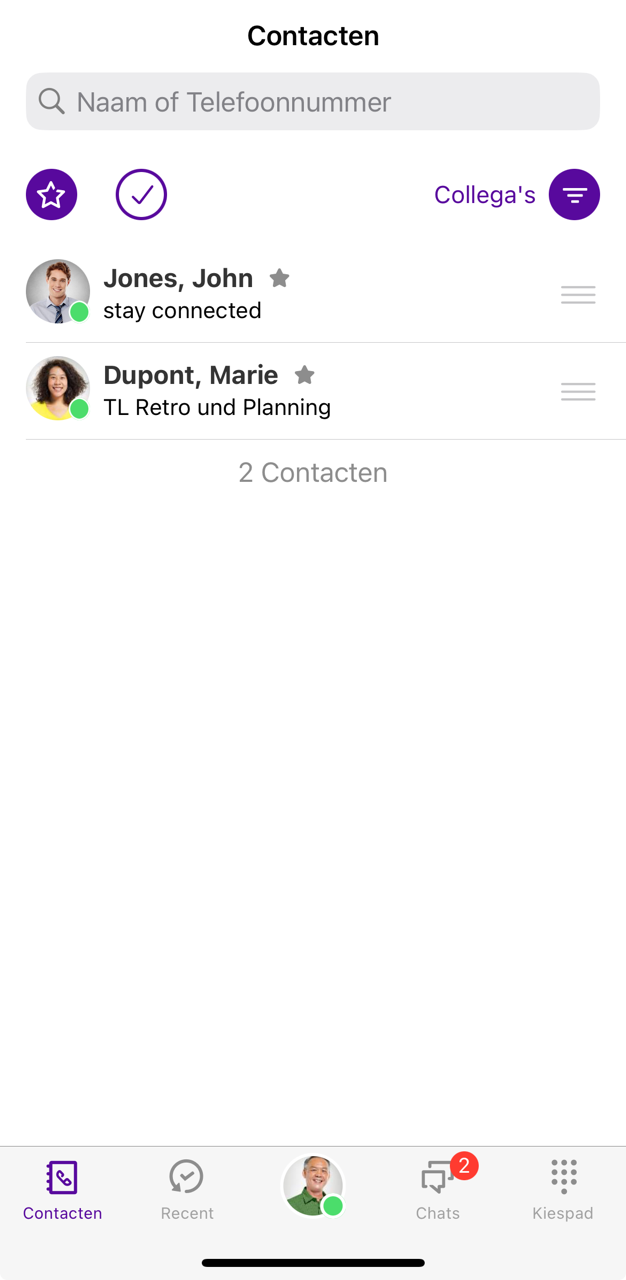 2 Om de contactbron te wijzigen, tik je op het actieve filter Collega's,Locals of Bedrijven.