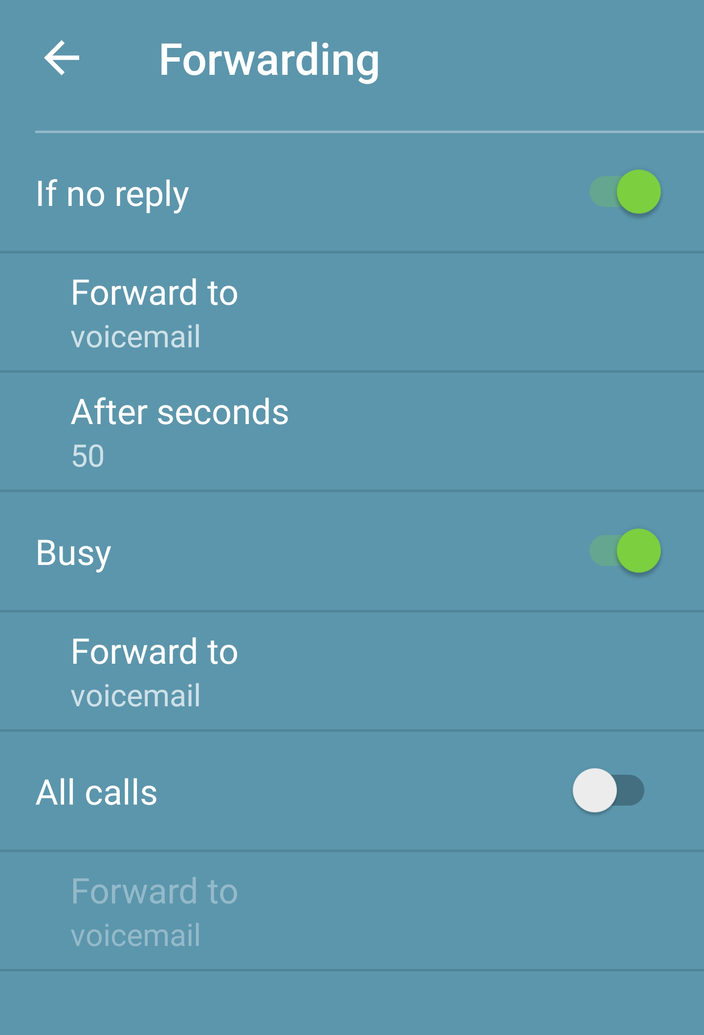 | If you set call forwarding for „All calls“, all other call forwarding settings are disabled automatically, i.e. all incoming phone calls are directly forwarded to the selected contact/ your voicemail. |