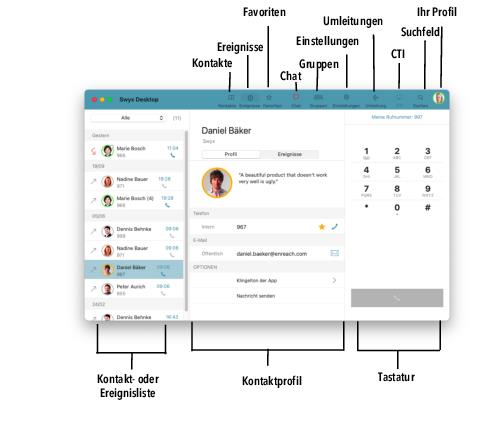 Die Benutzeroberfläche von Swyx Desktop ist so aufgebaut, dass Sie mit nur wenigen Klicks Zugriff auf alle hinterlegten Kontaktdaten Ihrer Kollegen und Geschäftspartner haben.