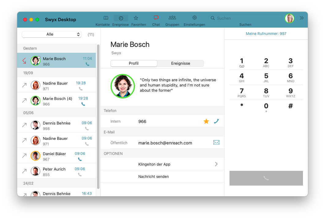 Die Datenaktualisierung des Swyx Desktop for macOS erfolgt automatisch in zyklischen Abständen. Zur manuellen Aktualisierung der Ereignisliste können Sie zusätzlich die Tastenkombination „CMD“ + „R“ nutzen. Siehe auch Manueller Abruf der Daten von SwyxServer.