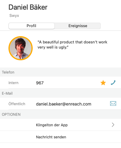 Kollegen und Geschäftspartner, mit denen Sie häufig telefonieren, können als Favoriten hinterlegt werden. Die entsprechende Nummer steht Ihnen dann im Menü Favoriten als Schnellwahl zur Verfügung, d. h. der Wählvorgang beginnt unmittelbar, wenn Sie auf das Profilbild klicken.