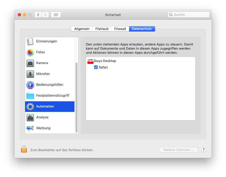 | Bei der ersten Ausführung eines Skripts werden Sie durch Ihren Mac dazu aufgefordert, die Ausführung zu erlauben (macOS 10.14 Mojave). Die Einstellungen können Sie zu einem späteren Zeitpunkt unter „Systemeinstellungen | Sicherheit | Datenschutz | Automation“ ändern. |