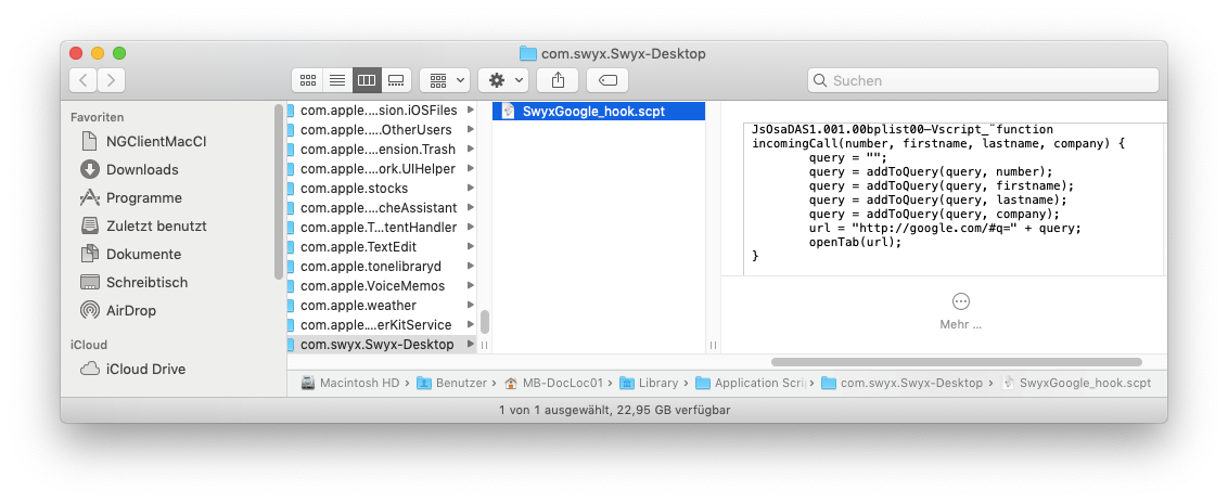 Es werden alle Skripte und Arbeitsabläufe unter ‚~/Library/Application Scripts/com.swyx.Swyx-Desktop/‘ ausgeführt, wenn ein Anruf eingeht.