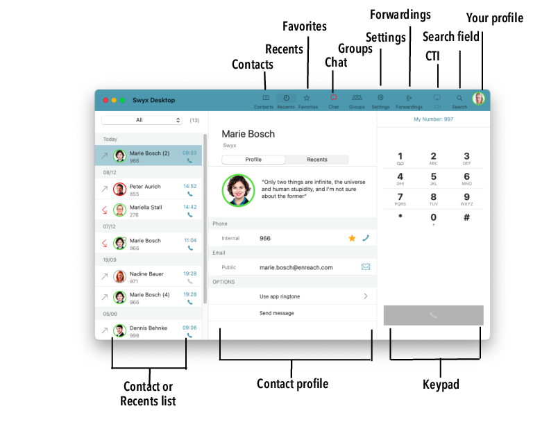 With the intuitive user interface of Swyx Desktop you have - with a few clicks - easy access to all contact details of your colleagues and business partners.