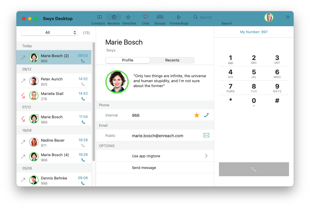 The server data for Swyx Desktop for macOS will be updated automatically in regular intervals. To manually update your recents list press the hot key combination “CMD” + “R”. See also Update the data from SwyxServer manually.