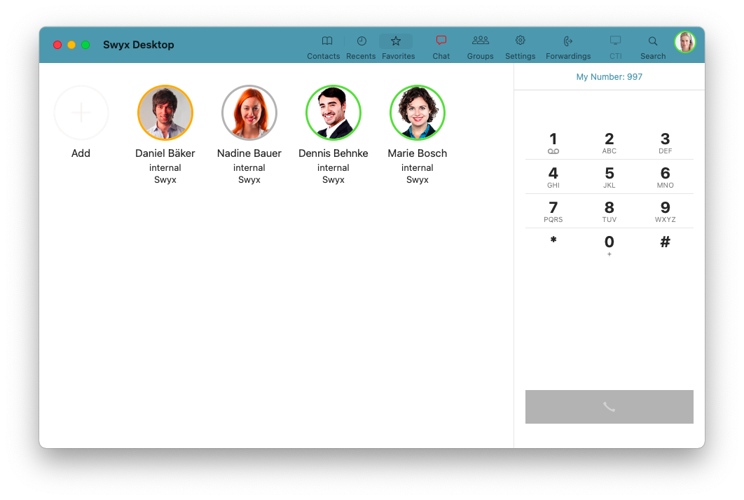 can add people and groups with whom you regularly make calls. Based on the circle color, you can see whether your contact is currently available, away, in a call or signed out.|