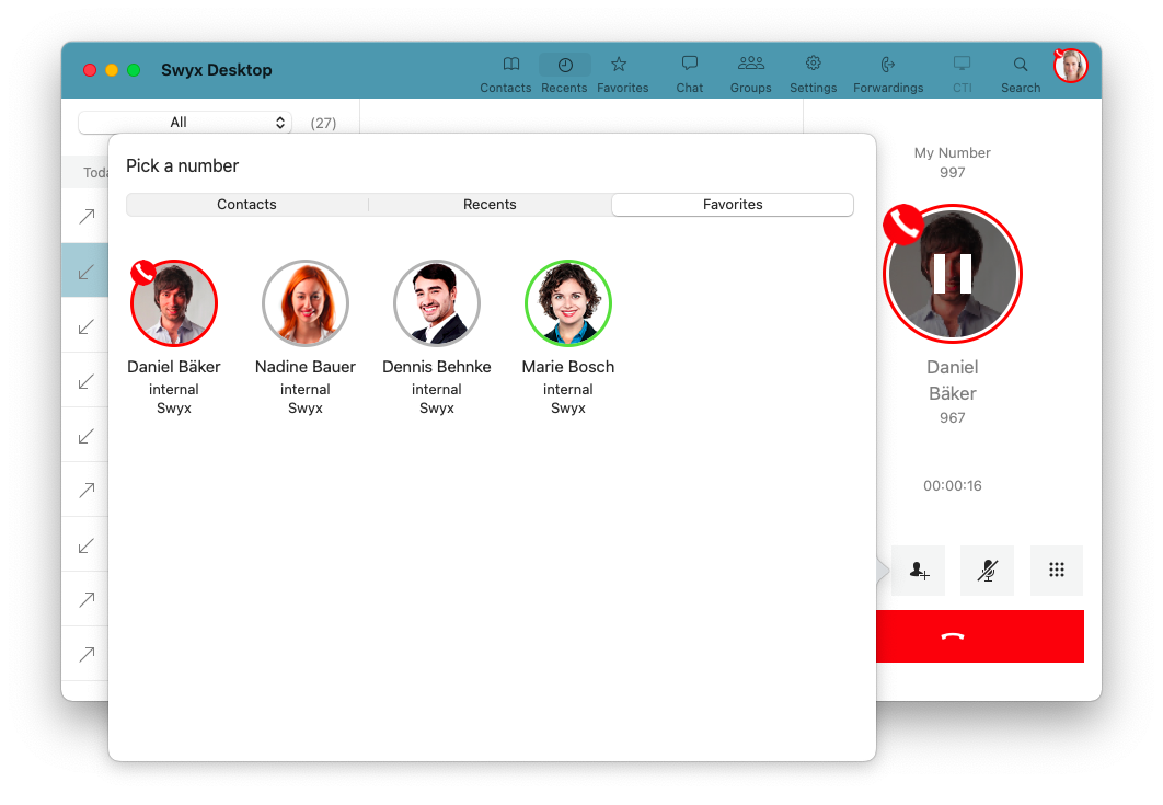 With Swyx Desktop, you can easily transfer an accepted phone call to another contact or to another device, e. g. Swyx Mobile.