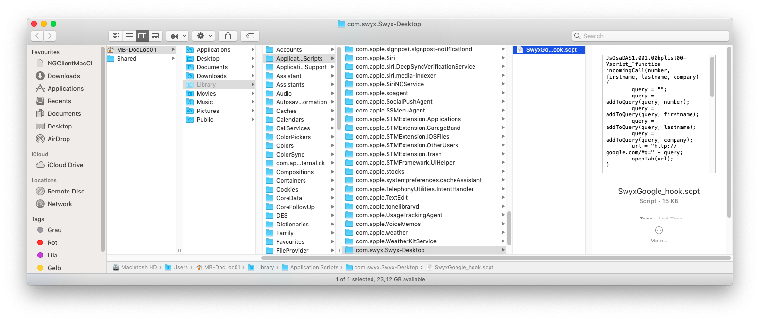 These can be executed from the Script Editor or automatically in Swyx Desktop for macOS when a call comes in.