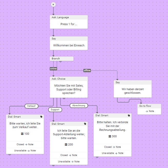 Im Hauptmenü unter Build können Sie auf die Flows zugreifen. Ein Flow ist eine Datei, die einen Konversationsablauf zwischen Bot und Benutzer in Form eines Graphen darstellt. Er besteht aus Knoten und Verknüpfungsfeile und zeigt eine lineare Abfolge von Schritten, die zusammen das Verhalten Ihres Bots definieren und werden ausgeführt, um eine bestimmte Aufgabe zu erledigen.