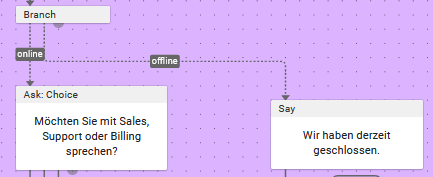 Ein Flow kann zwei oder mehr Zweige aufweisen, wenn Benutzereingaben verwendet werden, z. B. mit dem Knoten Ask choice. Wenn eine Verzweigung ohne direkten Input vom Benutzer erforderlich ist, kann die Knotenvariante Branch verwendet werden.