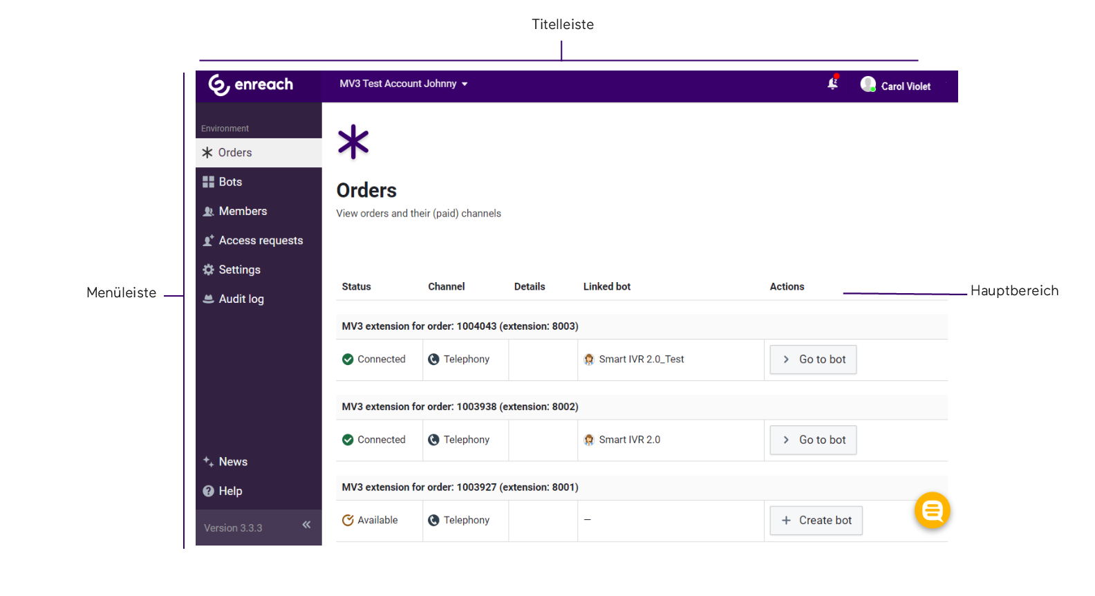 Die Benutzeroberfläche von der DialoX Plattform ist in drei Bereiche unterteilt: die Titelleiste, die Menüleiste und den Hauptbereich.