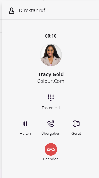 Sobald ein Anruf aufgebaut ist, können Sie das Tastenfeld öffnen, um DTMF-Ziffern einzugebe oder den aktiven Anruf an ein anderes Ziel weiterzuleiten, den Anruf in die Wartefelder zu legen und einen Gerätewechsel durchzuführen, um einen aktiven Anruf nahtlos an ein anderes Gerät weiterzuleiten.