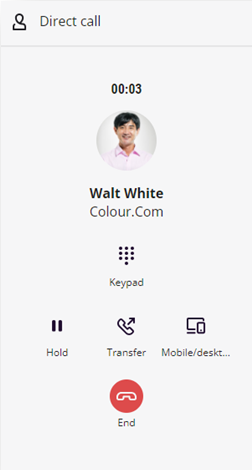 Once a call is established, you can open the keypad to enter DTMF digits, transfer the active call to another destination, put the call on hold, and perform a device switch to seamlessly transfer an active call to another device.