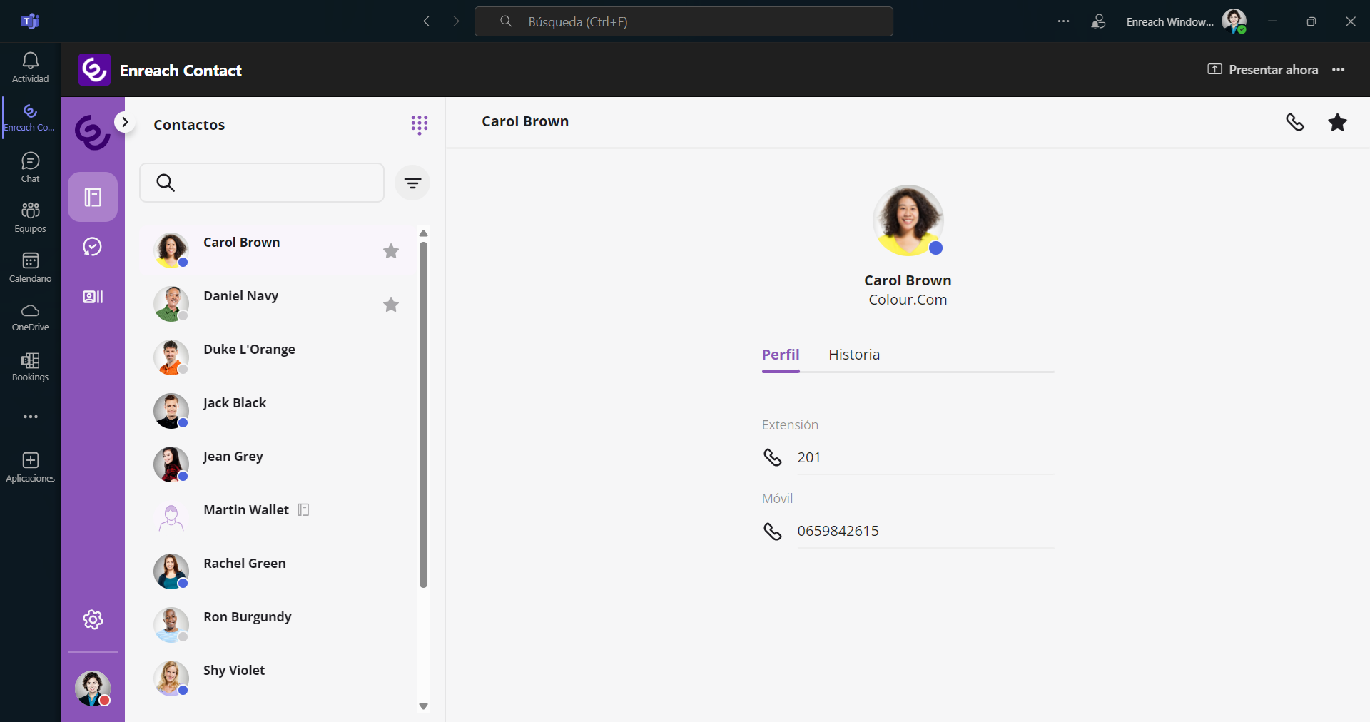 La interfaz de usuario de la App Enreach Contact para Microsoft Teams está dividida en tres partes: