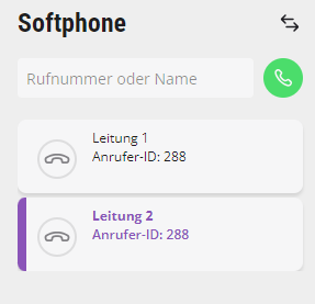 Auf der Bedienoberfläche werden die Leitungen durch Leitungstasten dargestellt. Die ausgewählte Leitung wird farblich markiert. Die für die Leitung konfigurierte Rufnummer für ausgehende Anrufe wird auf der Leitung angezeigt. Wenn Sie gerade einen Anruf aufzeichnen, wird dies auf der entsprechenden Leitung mit einem Symbol dargestellt.