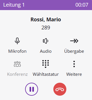 Wenn Sie einen Anruf erhalten oder starten, erscheint die integrierte Anrufsteuerung unterhalb der Leitungen. Dort haben Sie verschiedene Möglichkeiten den Anruf zu behandeln. Klicken Sie auf eine Leitung, um die jeweilige Anrufsteuerung anzuzeigen.