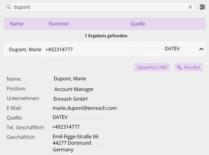 Kontaktdatenbank, in der den Kontakt gefunden wurde