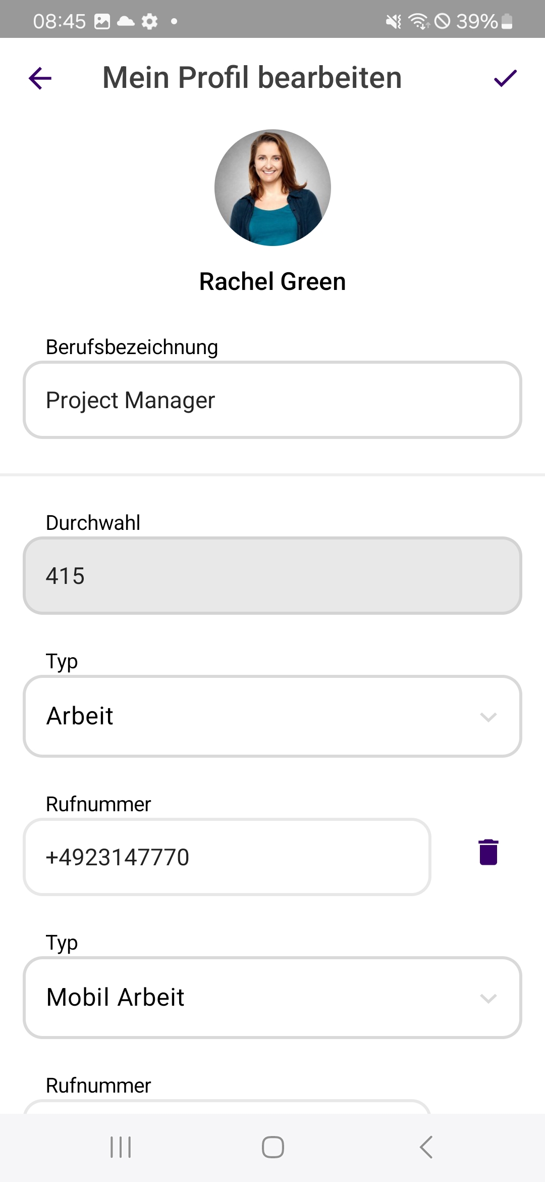 Im Bereich Mein Profil können Sie Ihre Durchwahl, Ihre verschiedenen Telefonnummern und Ihre E-Mail-Adresse sehen und
