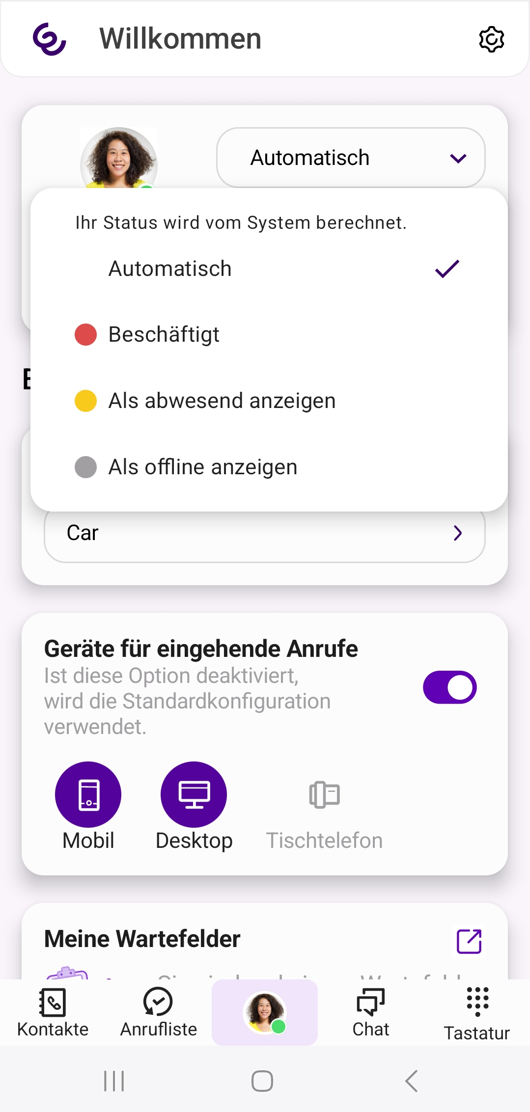 Sie können Ihren eigenen Status auswählen. Zur Verfügung stehen Automatisch, Beschäftigt, Als abwesend anzeigen und Als offline anzeigen.