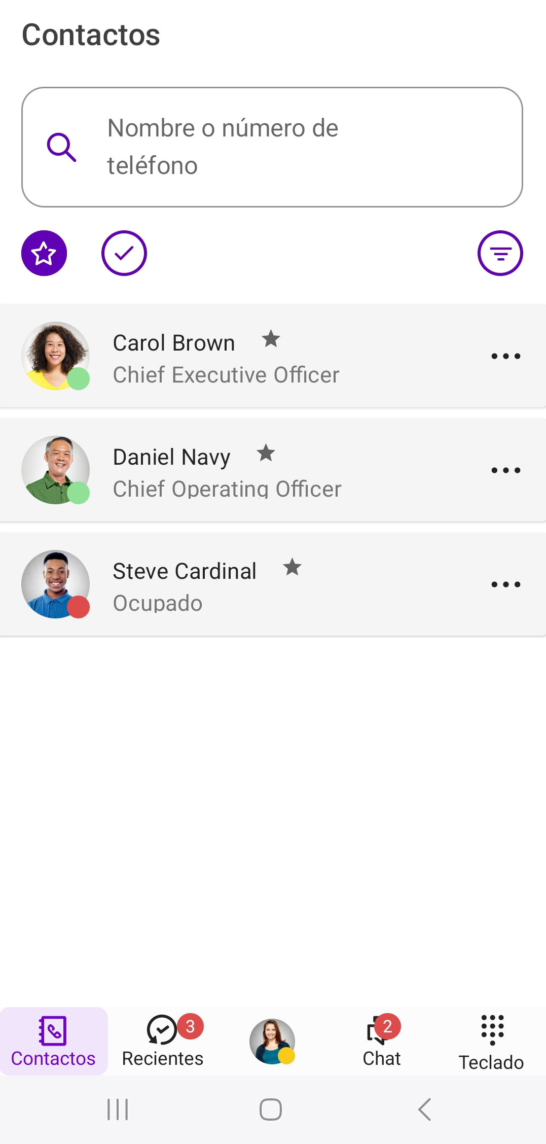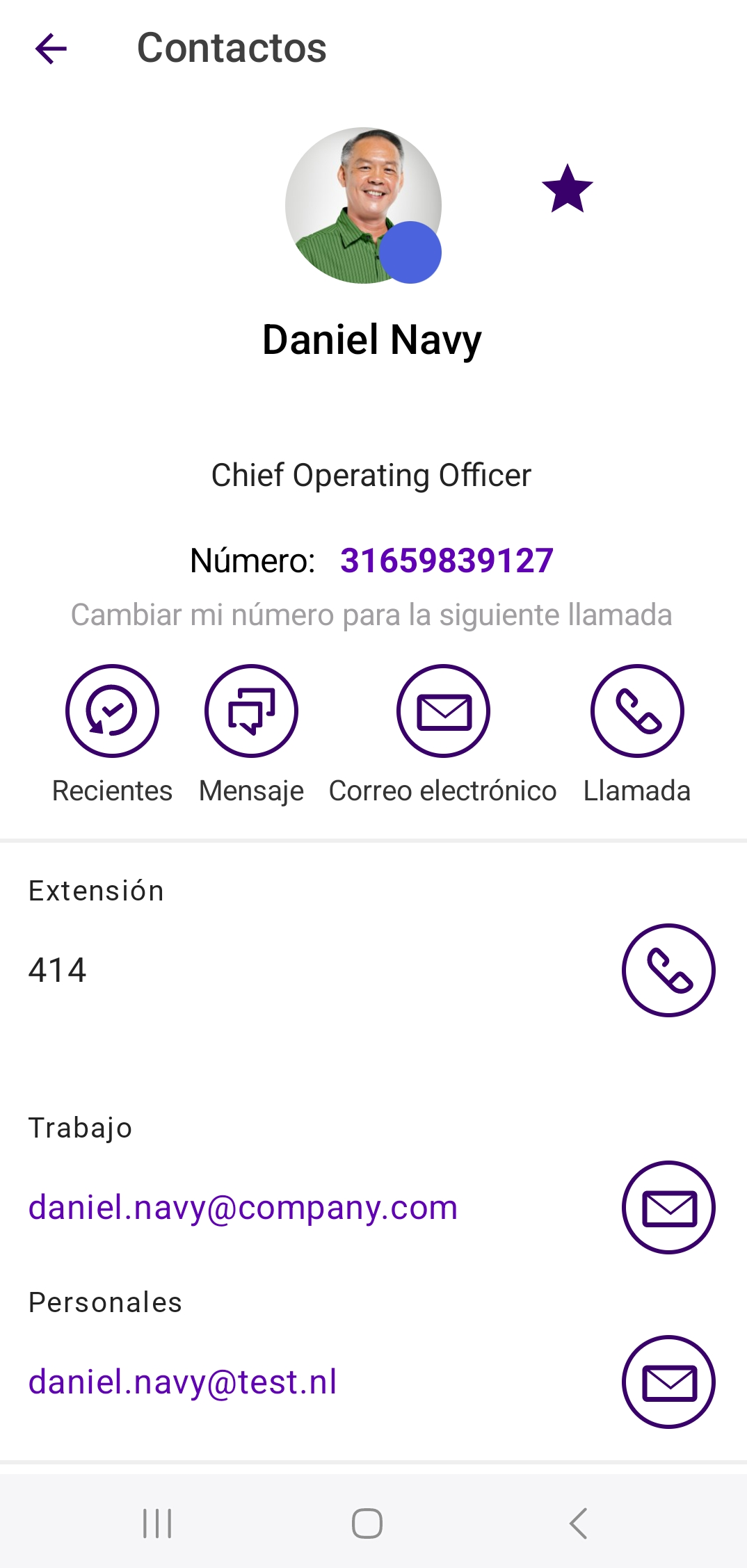 En la sección Contactos encontrarás los datos de contacto de tus compañeros y, si permites el acceso, de tus contactos, que tienes almacenados en el smartphone. Puedes añadir contactos a tus favoritos. Puedes utilizar un filtro (Compañeros, Empresa, Personal y Local) para limitar la visualización de los contactos. También puedes filtrar tus contactos por favoritos, así como ver sólo los contactos cuyo estado de campo de línea ocupada esté configurado como Disponible.