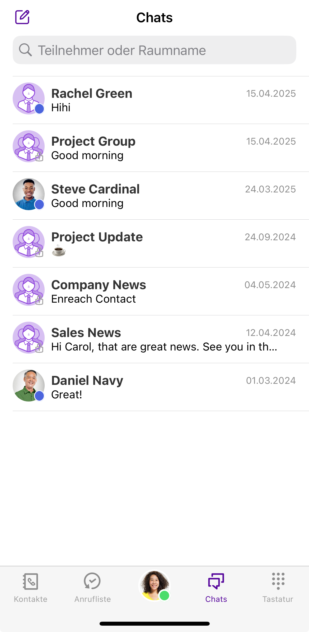 Über das Suchfeld können Sie innerhalb der Chats gezielt nach Teilnehmern oder Raumnamen suchen.