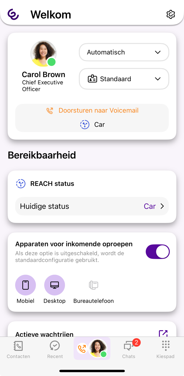 Mijn wachtrijen kun je zien in welke wachtrijen je bent aangemeld. Aanvullende persoonlijke informatie, zoals je doorkiesnummer of e-mailadres, vind je onder