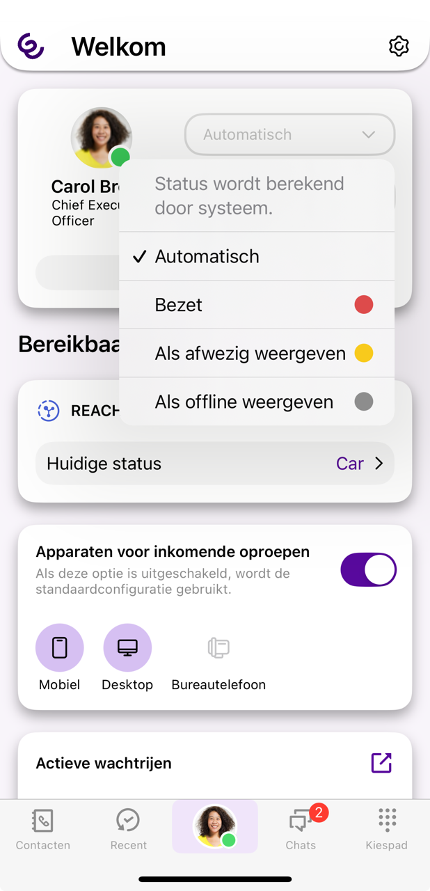 Je kunt jouw eigen aanwezigheidsstatus individueel instellen. De beschikbare opties zijn
